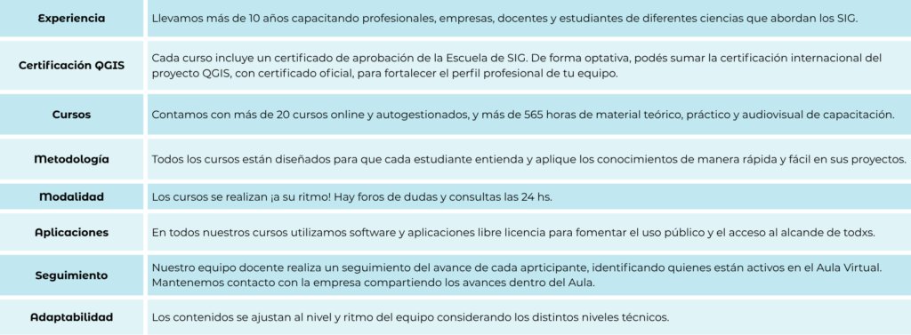 Nuestras capacitaciones para empresas cuentan con la opción de los Talleres de Consultoría en vivo para que cada estudiante trabaje con información y materiales propios de cada empresa/institución. Y también, con la posibilidad de la Certificación oficial en QGIS que proporciona el aval internacional de todos los conocimientos adquiridos en las capacitaciones.